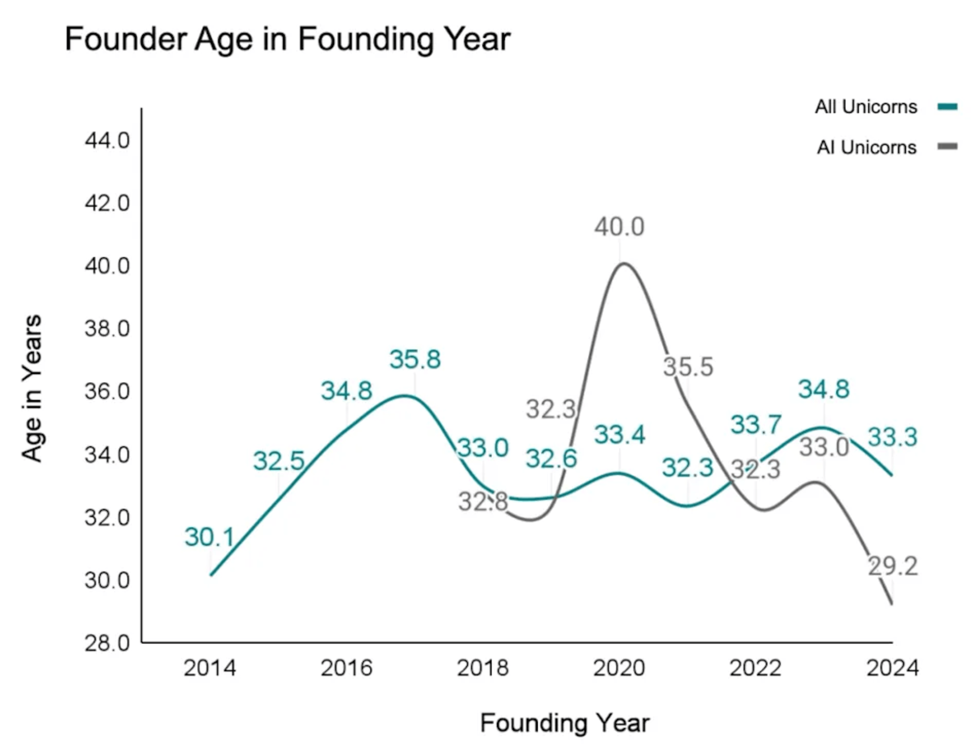 Stanford professor Ilya Strebulaev’s Unicorn Report instead finds the average age of a unicorn founder to be 35 years.